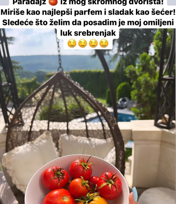 "Samo da se pohvalim! Paradajz iz mog skromnog dvorišta. Miriše kao najlepši parfem i sladak kao šećer. Sledeće što želim da posadim je moj omiljeni luk srebrenjak", otkrila je ponosno popularna JK.