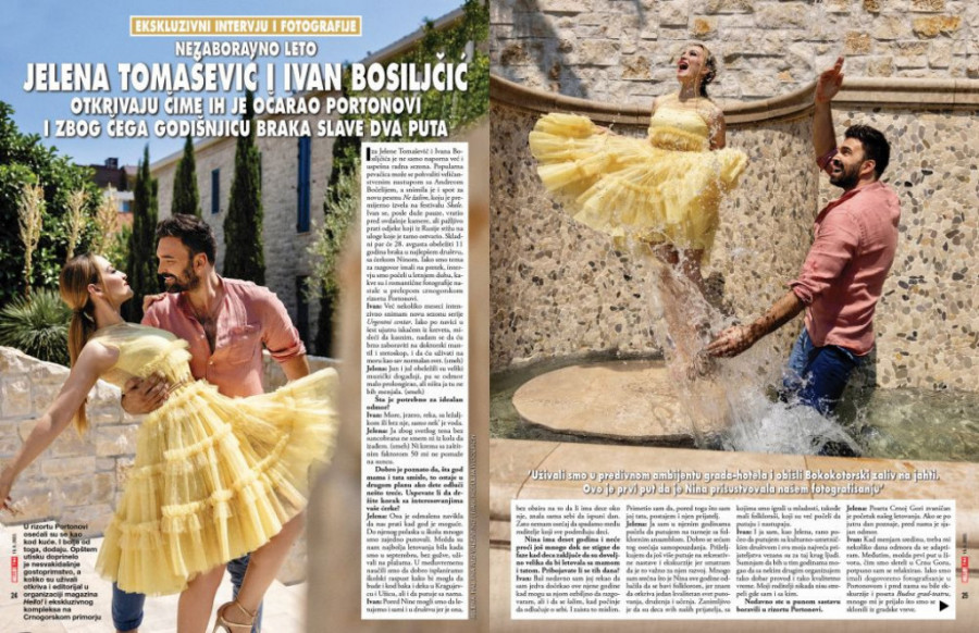 Iza Jelene Tomašević i Ivana Bosiljčića je ne samo naporna već i uspešna radna sezona. Popularna pevačica može se pohvaliti veličanstvenim nastupom sa Andreom Bočelijem, a snimila je i spot za novu pesmu “Ne žalim”, koju je premijerno izvela na festivalu “Skale”. Ivan se, posle duže pauze, vratio pred ovdašnje kamere, ali pažljivo prati odjeke koje iz Rusije stižu na uloge koje je tamo ostvario. Skladni par će 28. avgusta obeležiti 11 godina braka, u najlepšem društvu, sa ćerkom Ninom. Iako smo tema za razgovor imali na pretek, intervju smo počeli u letnjem duhu, kakve su i romantične fotografije nastale u prelepom crnogorskom rizortu Portonovi.