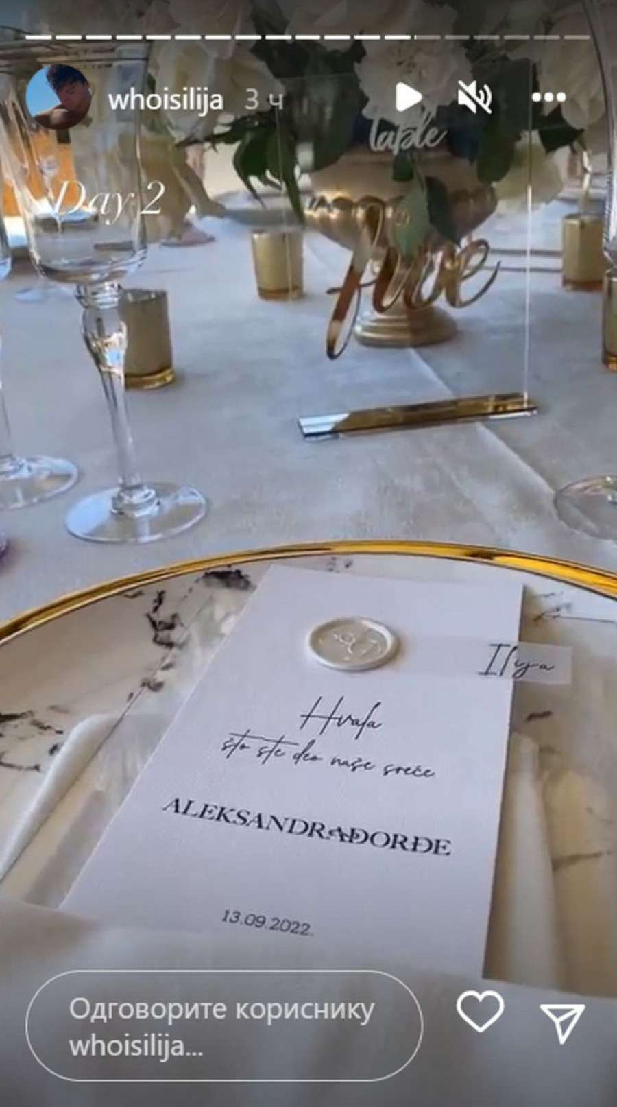 Danas je na plaži upriličena još jedna ceremonija, a mladenci su se pobrinuli da svaki detalj bude besprekoran. Dekoracija je u bež, belim i zlatnim tonovima, na stolovima je zlatni escajg, kao i veliki buketi ruža.