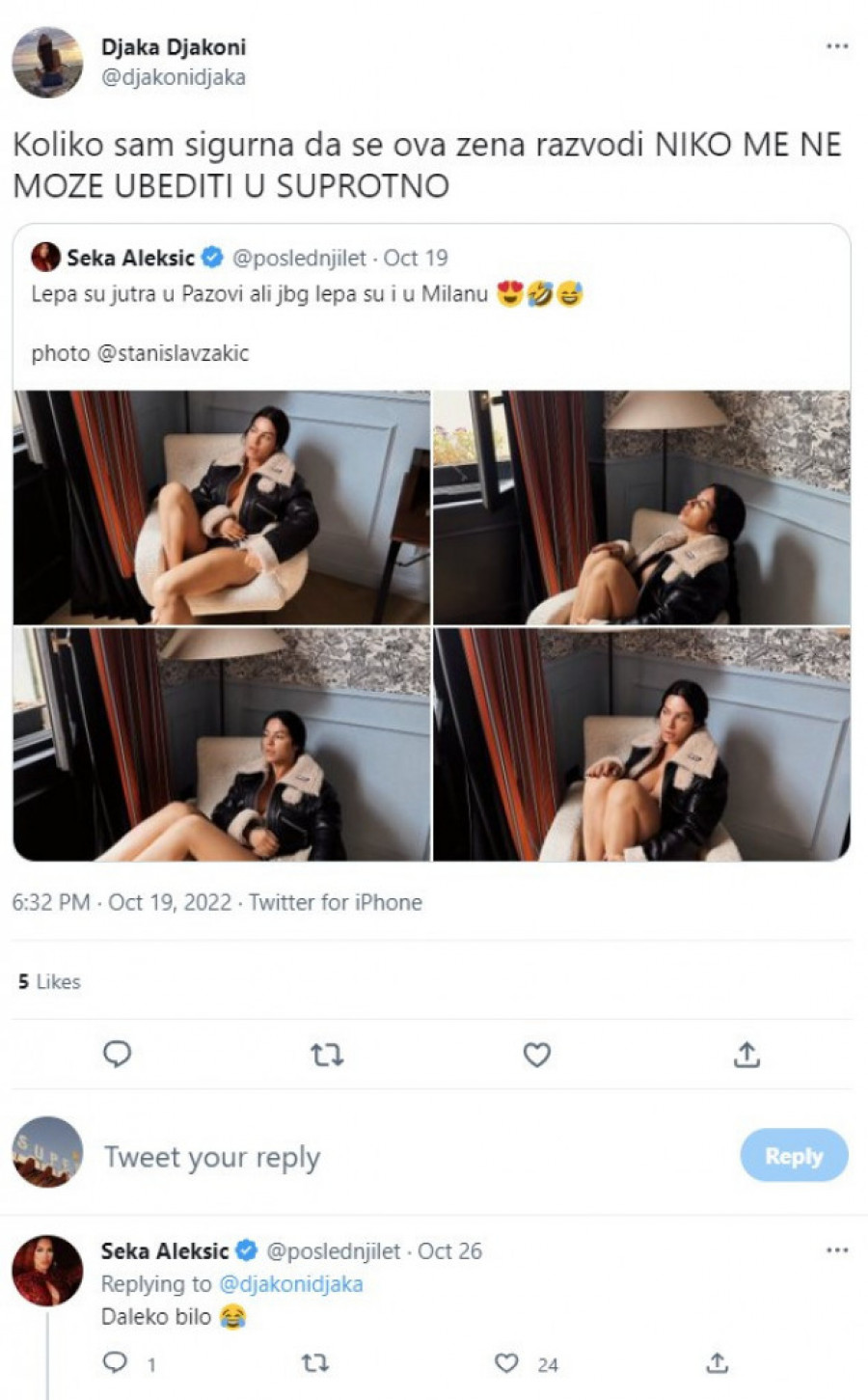 Ipak, Seka u poslednje vreme objavljuje sve slobodnije fotke, koje se tumače na različite načine. Tako je neko na Tviteru zaključio: “Koliko sam sigurna da se ova žena razvodi, niko me ne može ubediti u suprotno”.