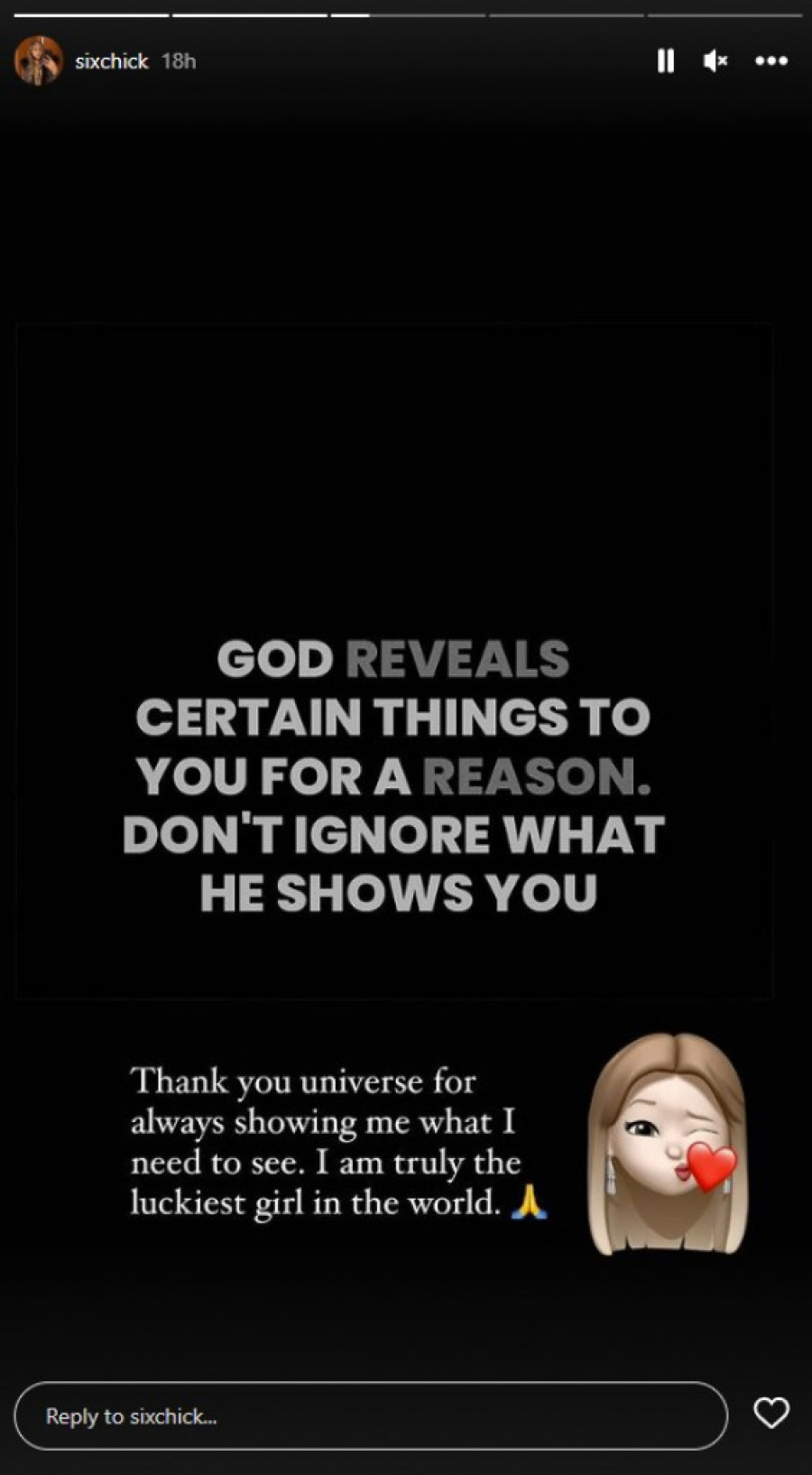 „Bog vam otkriva određene stvari s razlogom. Ne ignorišite ono što vam pokazuje. Hvala univerzumu što mi je pokazao ono što je trebalo da vidim. Zaista sam najsrećnija devojka na svetu.”