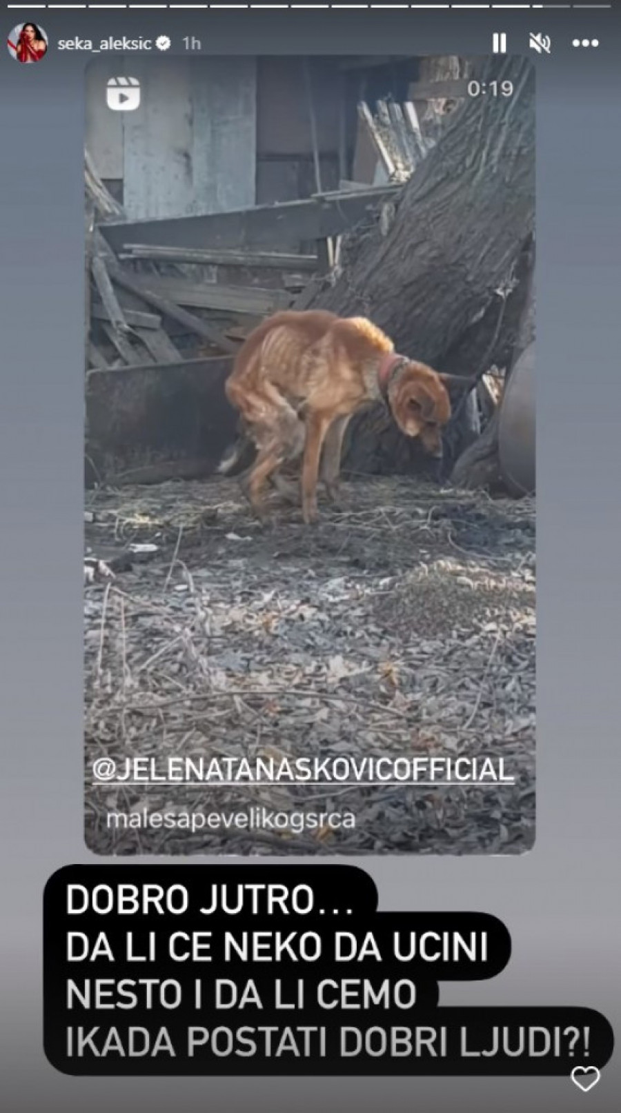 Ono što je sada spojilo dve zvezde nije nimalo lepo. Naime, na društvenim mrežama pojavio se uznemirujući snimak neuhranjenog psa koji u naselju Gaj živi u stravičnim uslovima. Kao veliki borci za zaštitu životinja i Seka i Jelena burno su reagovale na ono što su videle i poslale su apel nadležnim organima, koji će, nadamo se, što pre reagovati.