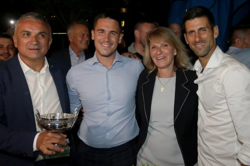 Novak i Marko na slavlju nose identične bele majice na kojima je silueta Srđana Đokovića kako drži tri prsta i natpis “Kosi tata, kosim ja”, kako glasi naziv pesme Dobrivoja Topalovića, po svemu sudeći omiljene u ovoj porodici.