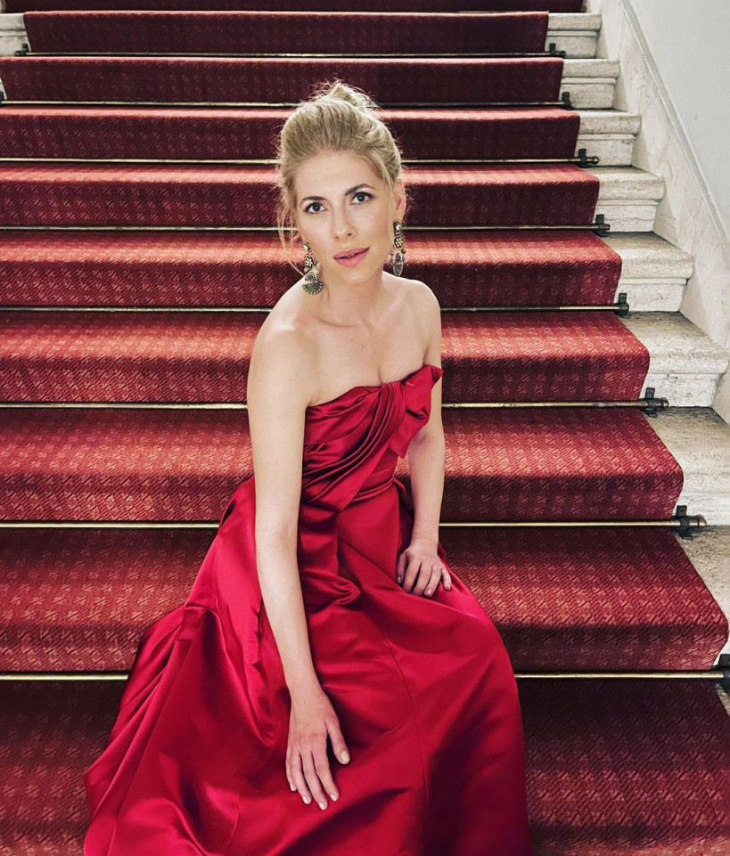 Jelena je za svečanost izabrala crvenu haljinu otvorenih ramena i elegantne srebrne sandale, a stajling je upotpunila minđušama i damskom torbicom.