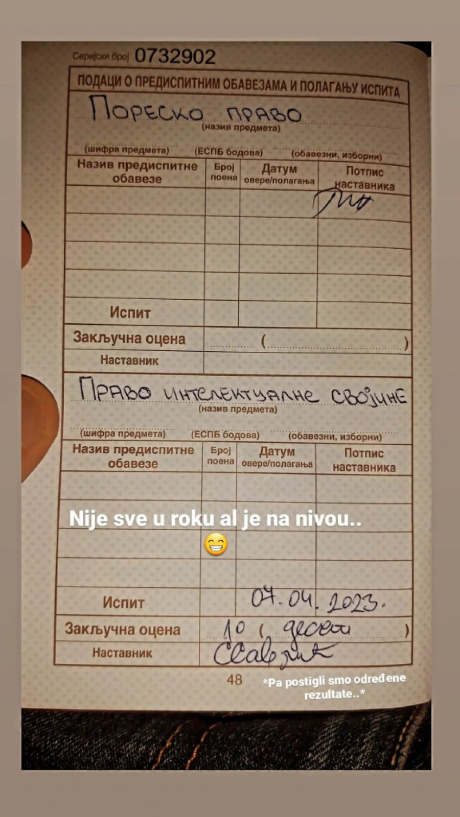 “Nije sve u roku, ali je na nivou”, poručio je u Instagram objavi, u kojoj se pohvalio ocenom 10 iz predmeta Poresko pravo.