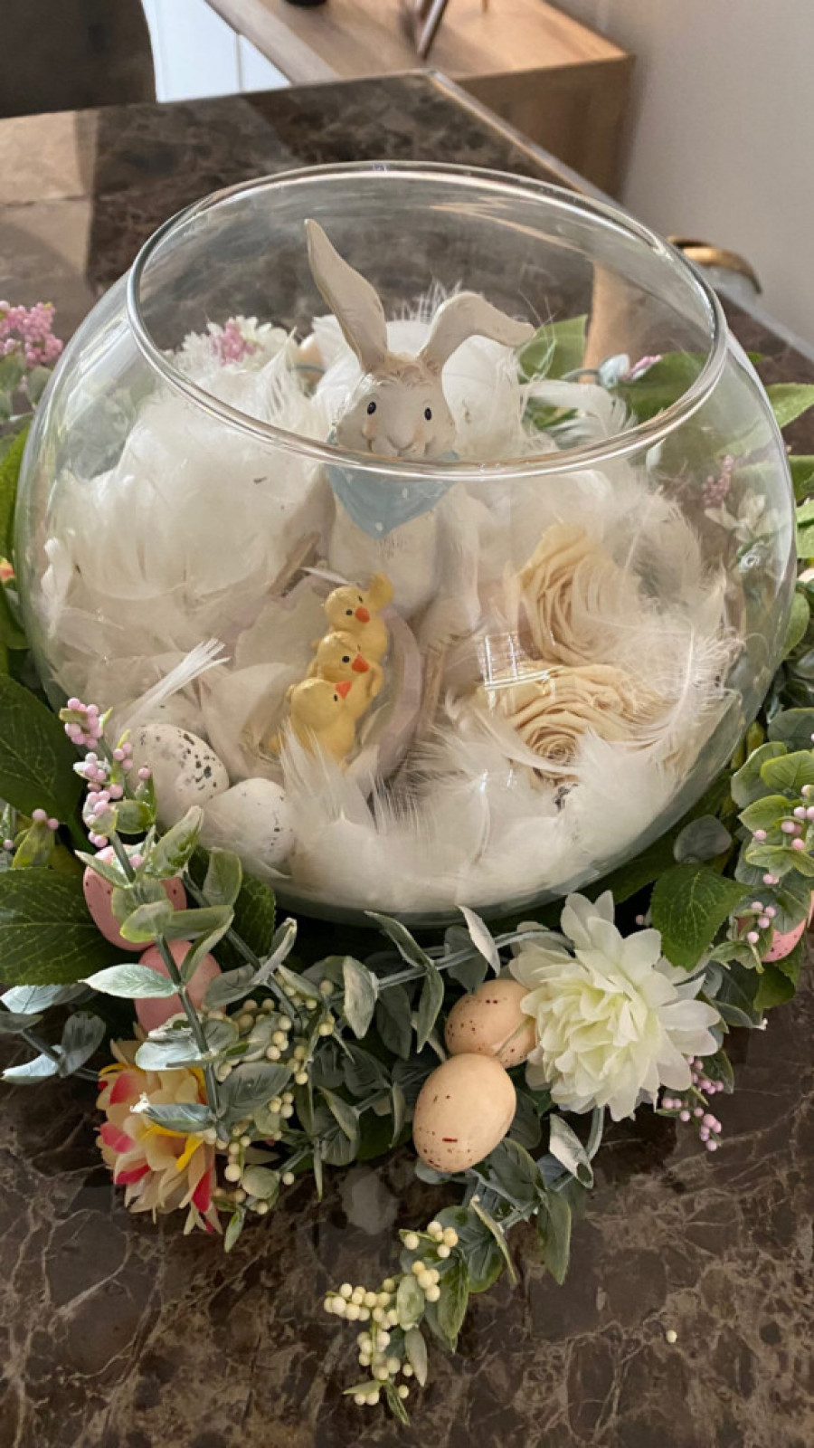 Dekoracije u duhu praznika Sonja Vuksanović smestila je u staklene posude, pa su do punog izražaja došli kolačići u obliku jaja ispečenih na oko, cvetni buket u kombinaciji sa svežom šargarepom, kao i ukrasne figure zečeva, pilića i jaja.