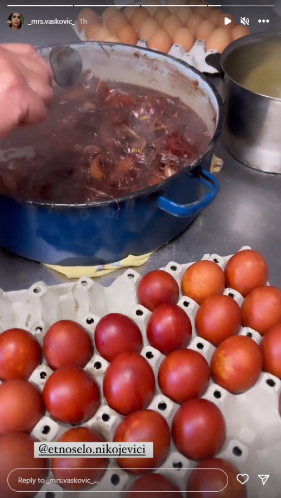 Mama Anđeline, Mihajla i Helene, Aleksandra Vasković odlučila je da ofarba celo tuce, i to na tradicionalan način. Lepa doktorka, supruga frontmena Leksington benda, jaja je obojila lukovinom, i to u starinskoj plavoj šerpi koja je ranije mogla da se nađe u svakom domaćinstvu, a danas asocira na neke lepe, bezbrižne dane.