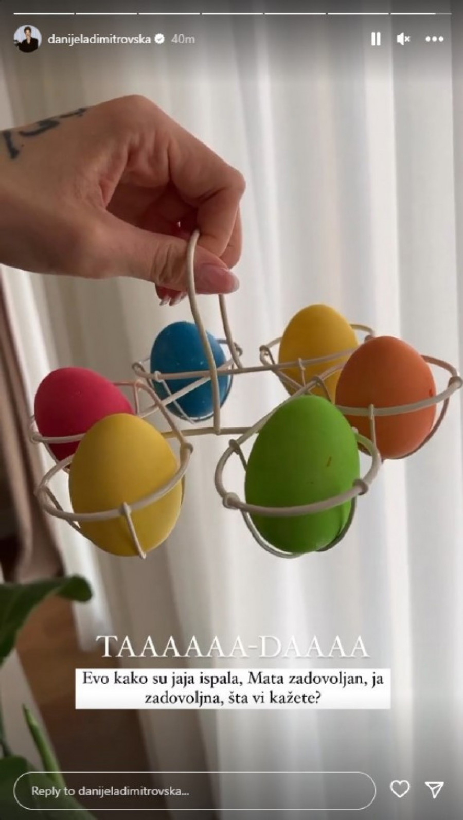 “Evo kako su jaja ispala. Matija zadovoljan, ja zadovoljna, šta vi kažete,” upitala je Danijela Dimitrovska pratioce na Instagramu, pokazujući im jednobojna jaja jarkih boja, koje je aranžirala u moderno dekorisanu posudu.