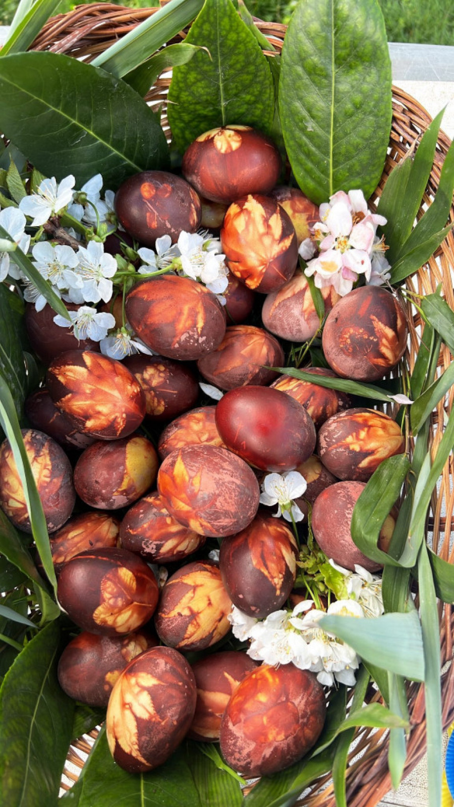 Za lukovinu se opredelio i bračni par Jovanović, Čedomir i Jelena, koji imaju četvoro dece. Jelena se potrudila i da jaja ukrasi listovima deteline, a sveže ofarbana jaja poređala je u pletenu korpicu ukrašenu belim cvetovima i lišćem.