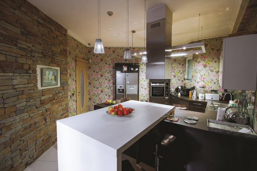 Kuhinja je u kombinaciji belih i tamnih tonova, krase je tapete sa motivima cveća kao i, krajnje nesvakidašnje, crteži Milića od Mačve i Jelene Blečić.