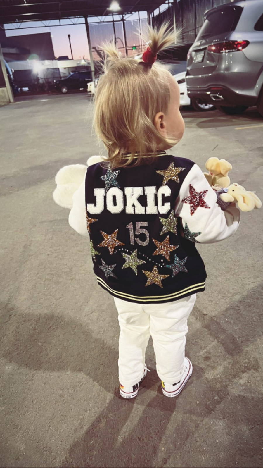 Tu su starke, omiljene plišane igračke, simpatična frizura, a devojčica je ovom, verovatno specijalnom prilikom, na sebi imala i jaknu sa brojem 15, mnoštvom zvezda i natpisom „Jokić“. Apsolutno neodoljivo!