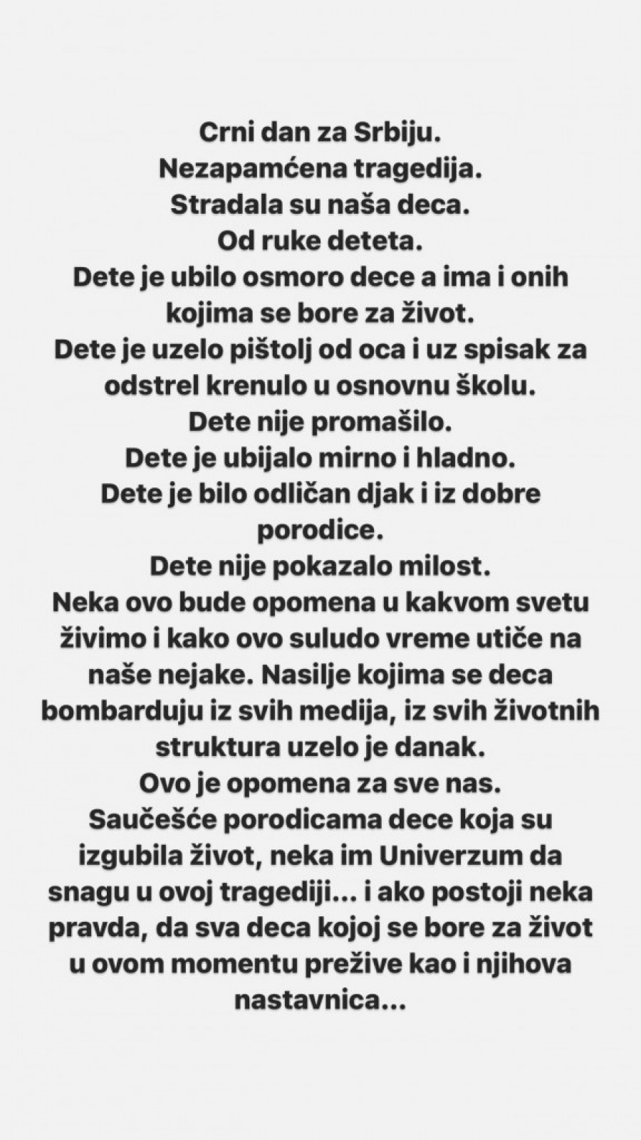 “Crni dan za Srbiju. Nezapamćena tragedija. Stradala su naša deca. Od ruke deteta. Dete je ubilo osmoro dece, a ima i onih kojima se bore za život. Dete je uzelo pištolj od oca i uz spisak za odstrel krenulo u osnovnu školu. Dete nije promašilo. Dete je ubijalo mirno i hladno. Dete je bilo odličan đak i iz dobre porodice. Dete nije pokazalo milost. Neka ovo bude opomena u kakvom svetu živimo i kako ovo suludo vreme utiče na naše nejake. Nasilje kojima se deca bombarduju iz svih medija, iz svih životnih struktura, uzelo je danak. Ovo je opomena za sve nas.