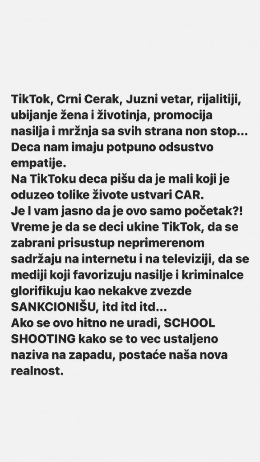 Ako se ovo hitno ne uradi, SCHOOL SHOOTING, kako se to već ustaljeno naziva na Zapadu, postaće naša nova realnost”, poručila je Karleuša na Instagramu.
