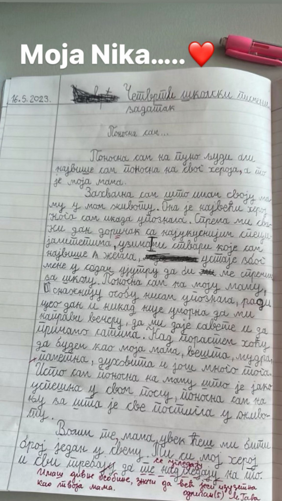 Volim te, mama, uvek ćeš mi biti broj jedan u svemu. Ti si moj heroj i svi treba da se ugledaju na to”, napisala je Nika u svom radu.