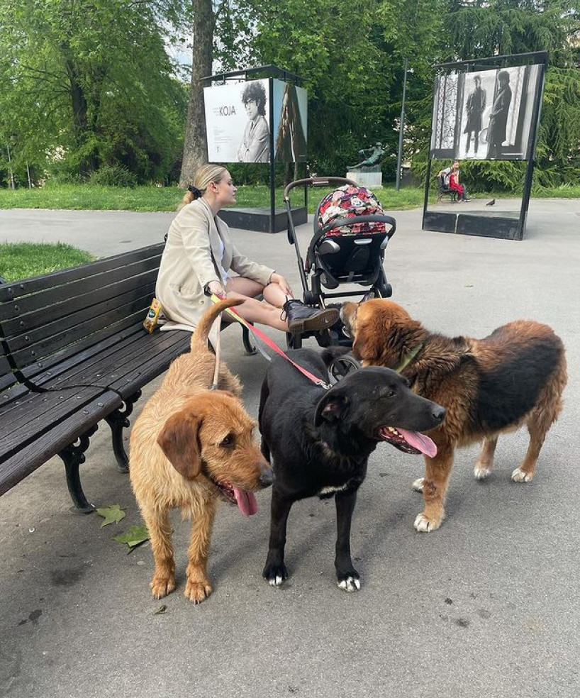 Mina Sovtić u novoj ulozi se, nema sumnje, odlično snašla, a tome u prilog govori i to što istovremeno vešto gura kolica sa bebom i šeta tri psa. A kad se umori, klupa na Kalemegdanu pravo je mesto za predah pre povratka kući.