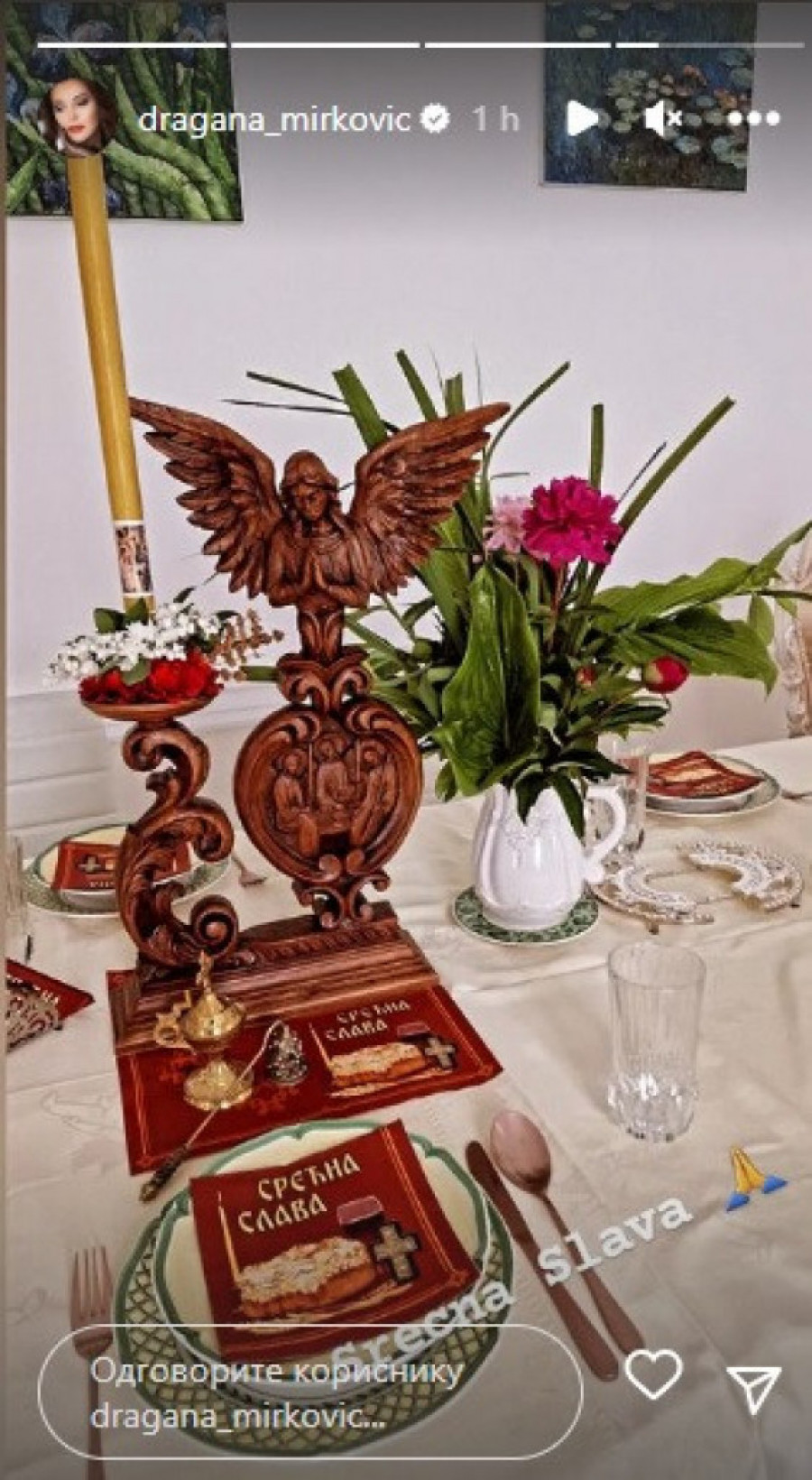 Muzička zvezda u društvu supruga Tonija Bijelića, obeležila je važan datum za porodicu Mirković, a kako smo mogli da vidimo na fotografiji, koja je nastala u njihovoj kući, Dragana je spremila slavski sto ukrašen figurom anđela, svećom, ali i prelepim cvećem, kao i dekorativnim tanjirima, dok je ispod objave čestitala svima koji slave.