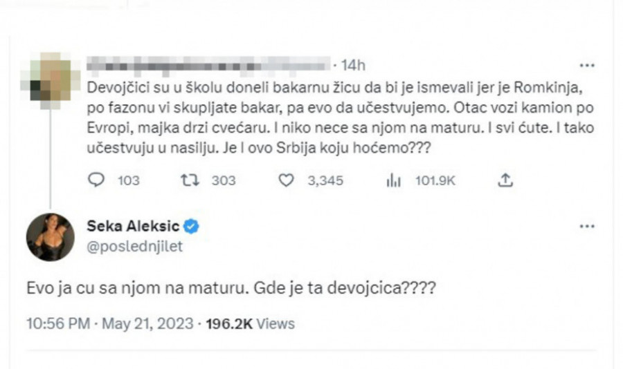 Kako je dospela u javnosti vest o devojčici Mii, koja je bila žrtva vršnjačkoj nasilja u školi u Vrbasu, tako je pevačica Seka Aleksić rešila da da podršku tinejdžerki i svojim gestom oduševi mnoge.