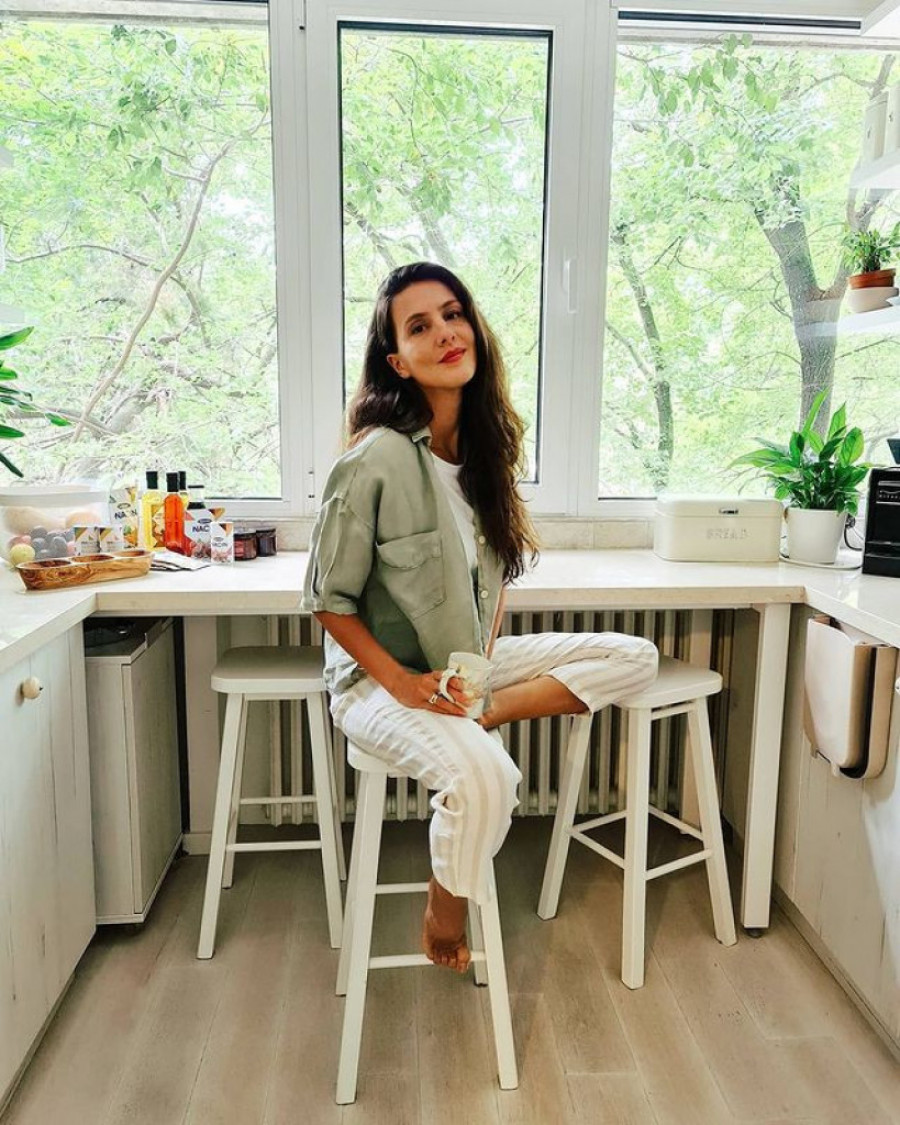 Kuhinja je u beloj boji i moderno uređena. Centralno mesto zauzima manji sto, smešten tik uz široke prozore koji otkrivaju pogled na visoko drveće, pa je teško poverovati da je sa druge strane stakla užurbani Novi Beograd.