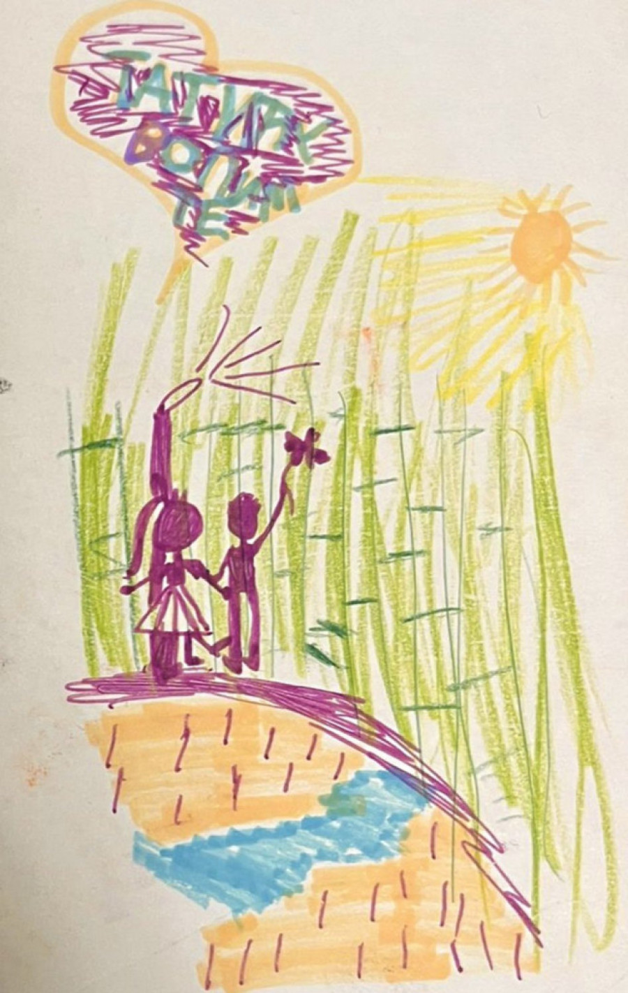 Reč je o predivnom crtežu veselih boja, kakav samo sedmogodišnjakinja može da napravi. U prvom planu su tata i ćerka koji, držeći se za ruke, šetaju stazom obasjanom suncem.