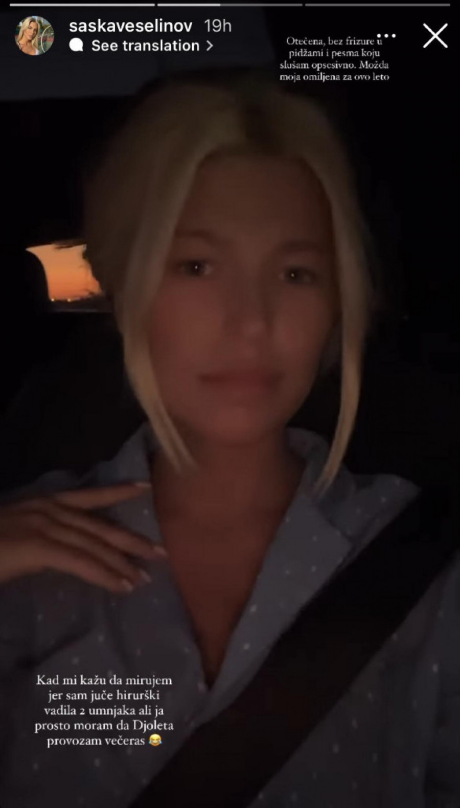 „Otečena, bez frizure, u pidžami i pesma koju slušam opsesivno. Kad mi kažu da mirujem jer sam juče hirurški vadila dva umnjaka, ali ja prosto moram da se provozam“, napisala je Saška uz snimak.