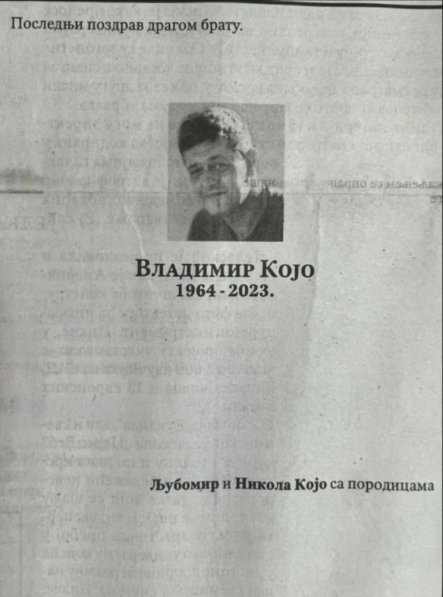 Sahrana se održava danas na Novom groblju, a čitulju su u Novostima dali Ljubomir i Nikola Kojo s porodicama uz poslednji pozdrav dragom bratu.