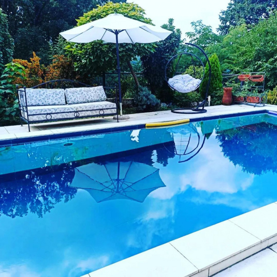 Osim po brižljivo uređenom dvorištu, imanje se izdvaja i po tome što ima veliki bazen pored koga su, kao u najbolje opremljenim hotelima, smeštene udobne ležaljke. Mesta za odmor ima i na velikoj terasi, gde se nalazi udobna garnitura sa ukrasima od kovanog gvožđa.