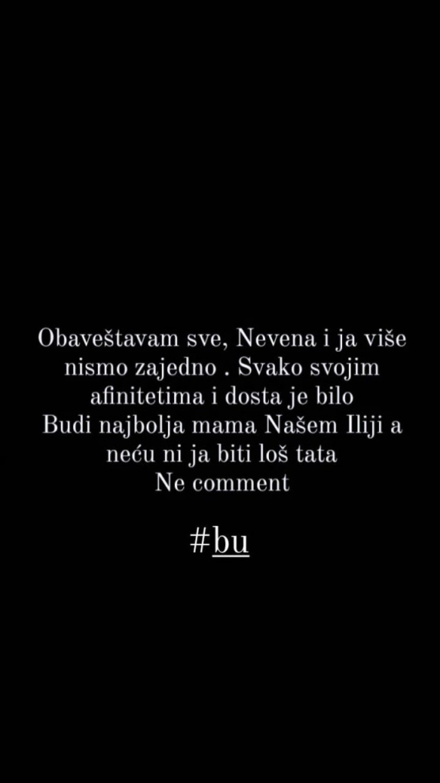 “Obaveštavam sve, Nevena i ja više nismo zajedno. Svako svojim afinitetima i dosta je bilo. Budi najbolja mama našem Iliji, a neću ni ja biti loš tata. Nemam komentar”, kratko je napisao Saša Joksimović na Instagramu.