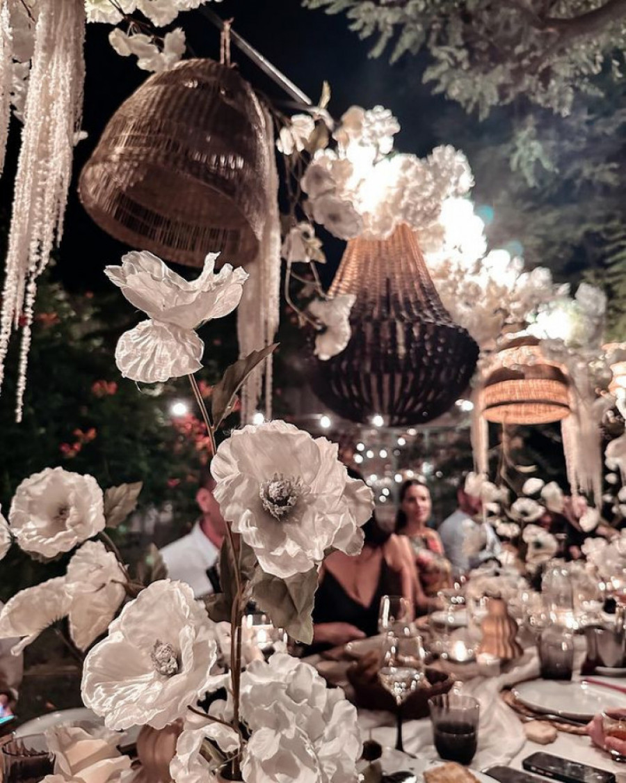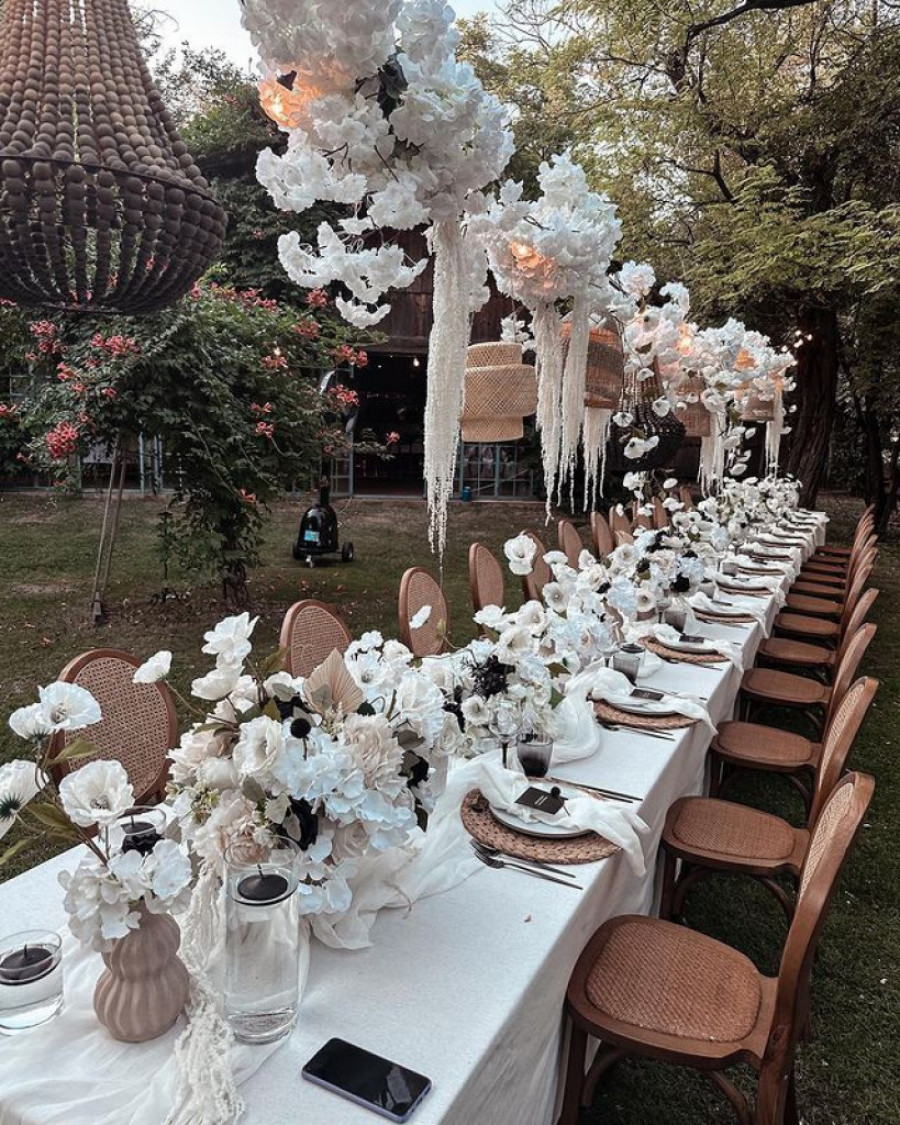 Dugačak sto, mnoštvo elegantnih belih detalja, od posuđa do cvetnih aranžmana i ukrasa, sveće u čaši, pleteni lusteri... I sve to pod vedrim letnjim nebom.