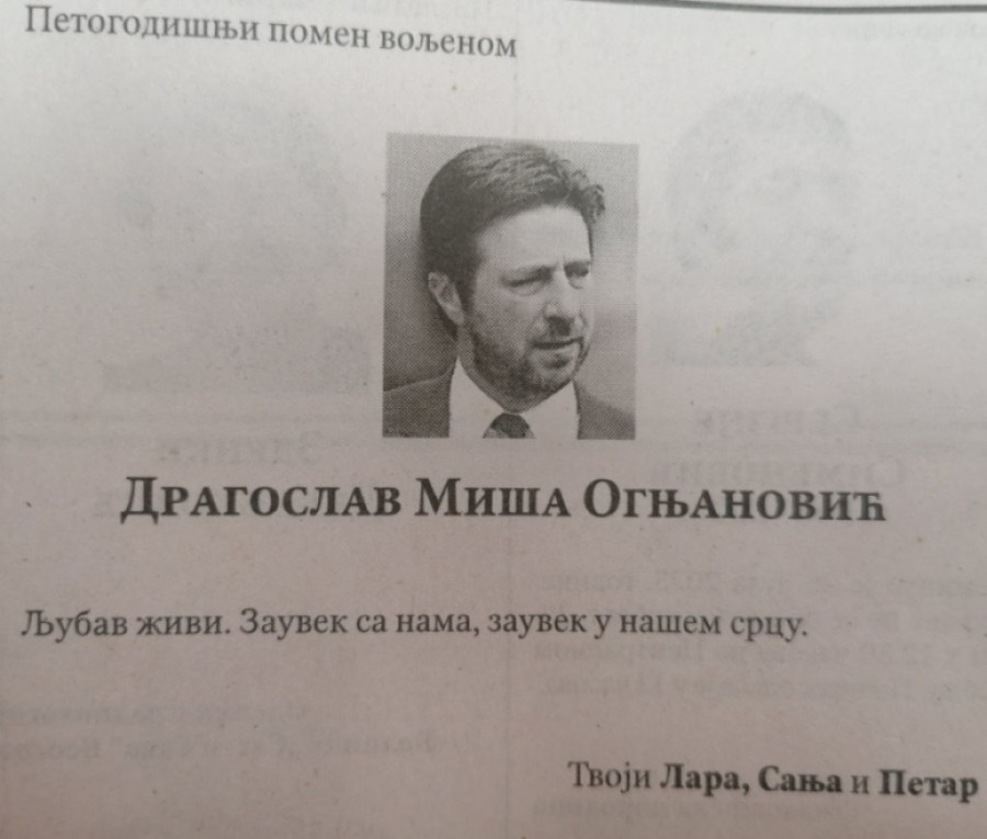 Pet godina je prošlo od svirepog ubistva Dragoslava Miše Ognjanovića. Tim tužnim povodom danas su se ispred večne kuće uglednog advokata na Novom groblju okupili članovi porodice i prijatelji. Među prvima se pojavila njegova supruga, bivša misica Sanja Papić.