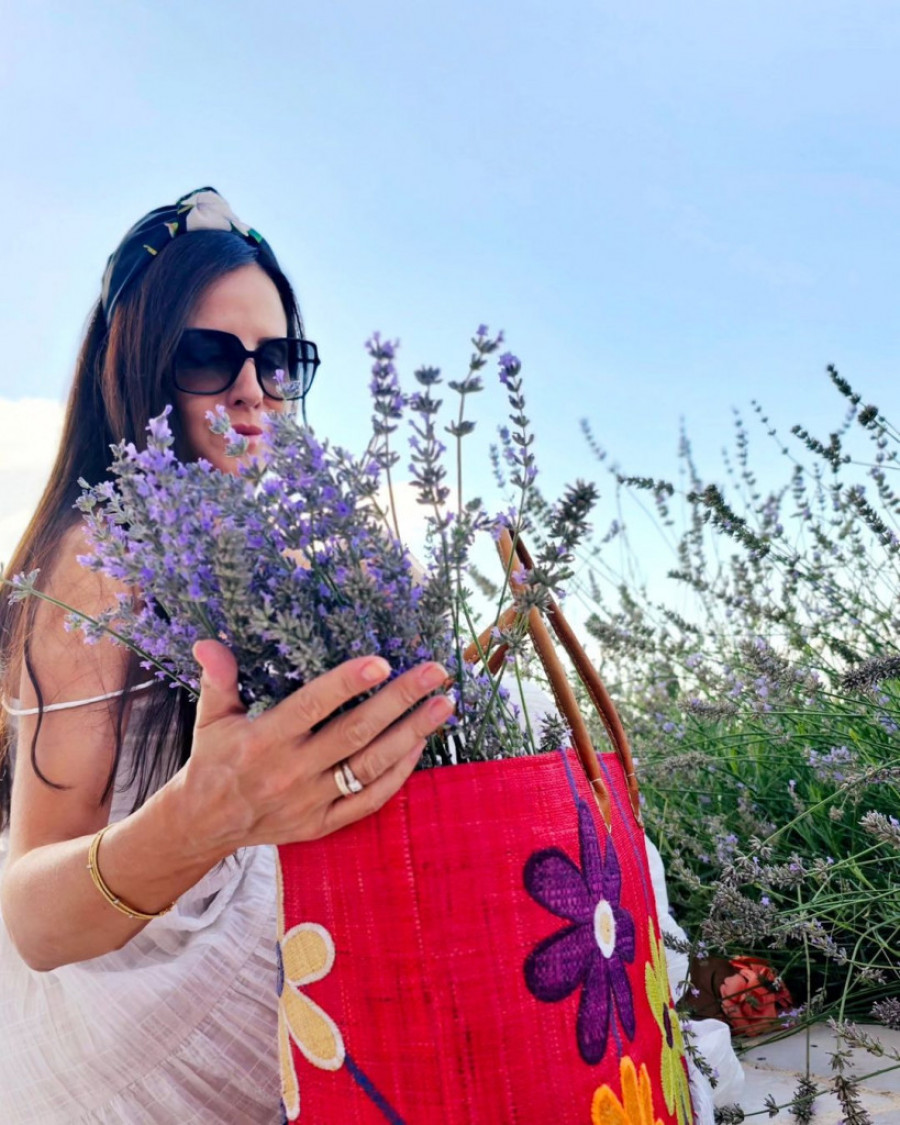 Kroz ljubičasto polje krstarila je u laganoj letnjoj haljini na bretele, sa ukrasnom trakom u kosi, autentičnom torbom sa velikim cvetnim aplikacijama, a primetili smo još nešto. Nešto što je verovatno uvek tu, ali do sada nismo obratili pažnju...