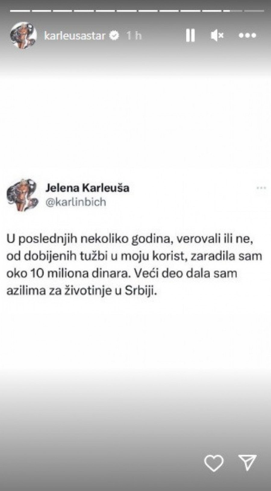 - U poslednjih nekoliko godina, verovali ili ne, od dobijenih tužbi u moju korist, zaradila sam oko 10 miliona dinara. Veći deo dala sam azilima za životinje u Srbiji - otkrila je Kraleuša u svojoj objavi.