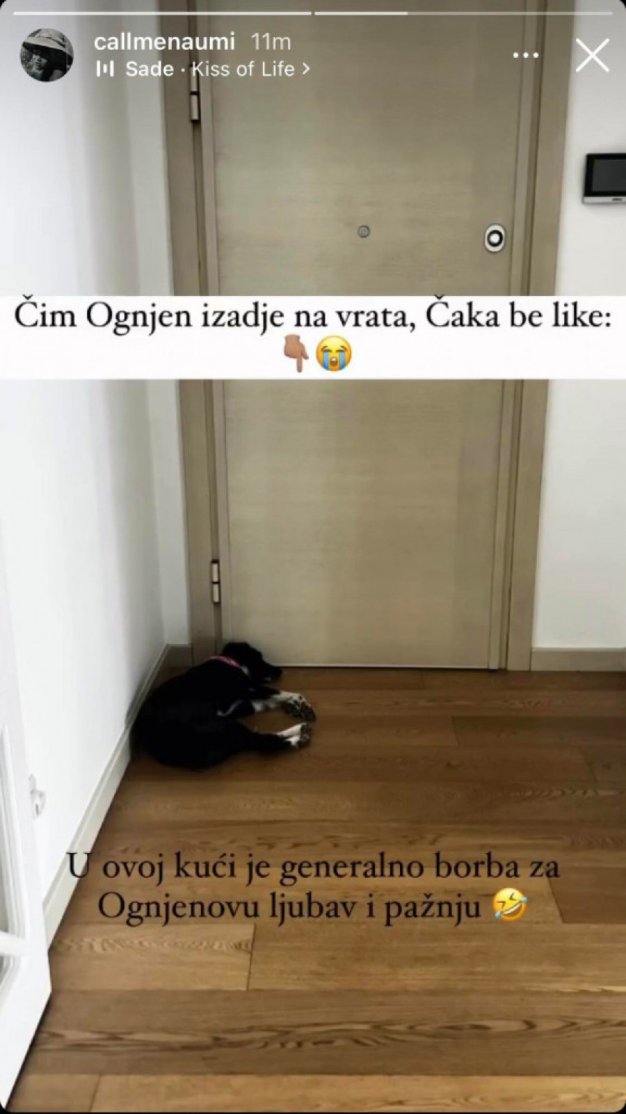 – Čim Ognjen izađe na vrata, Čaka je ovakav. U ovoj kući je generalno borba za Ognjenovu ljubav i pažnju – našalila se Mina uz fotografiju Čake koji leži na ulaznim vratima.
