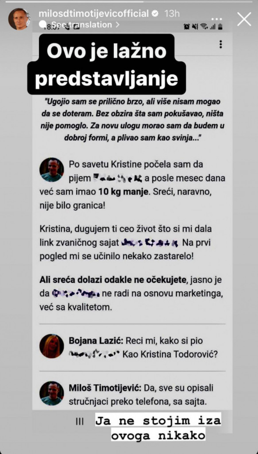 Internet je tekovina civilizacije, ali pored raznih informacija i slika koje su nam sada dostupne preko mreže, mnogi koriste onlajn prostor za manipulaciju i prevare. Tako je i Miloš Timotijević postao žrtva lažnog predstavljanja, a osoba je u njegovo ime promovisala proizvod za mršavljanje.