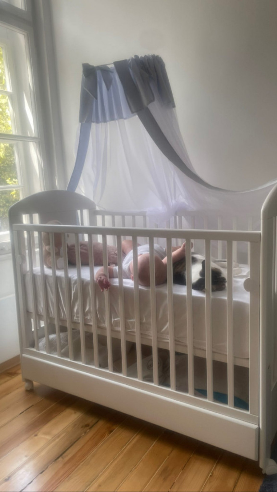 Beli krevetac okupan je suncem, a iznad njega je baldahin nežno plave boje. Kao što možemo videti na fotografiji, Luni pored plišanog medvedića društvo pravi mačak Bartolomeo.
