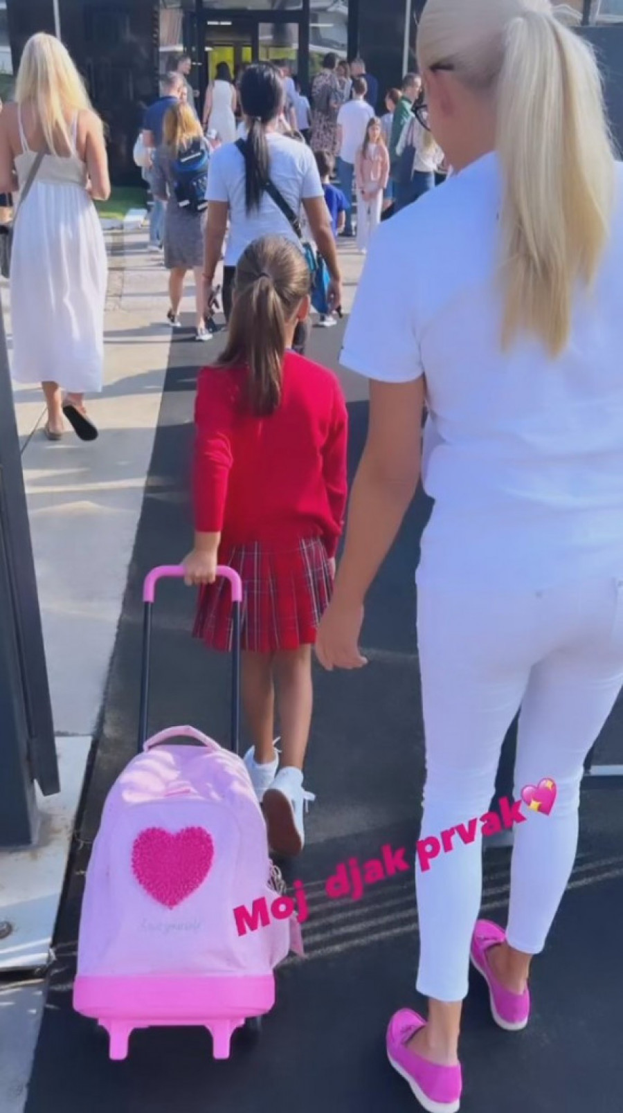 Pevačica Ilda Šaulić u školu je stigla zajedno sa ćerkom Emom, kojoj ranac bebiroze boje sa ogromnim crvenim srcem očigledno nije bio težak. Doduše, ponosna mama joj je malo pomogla.