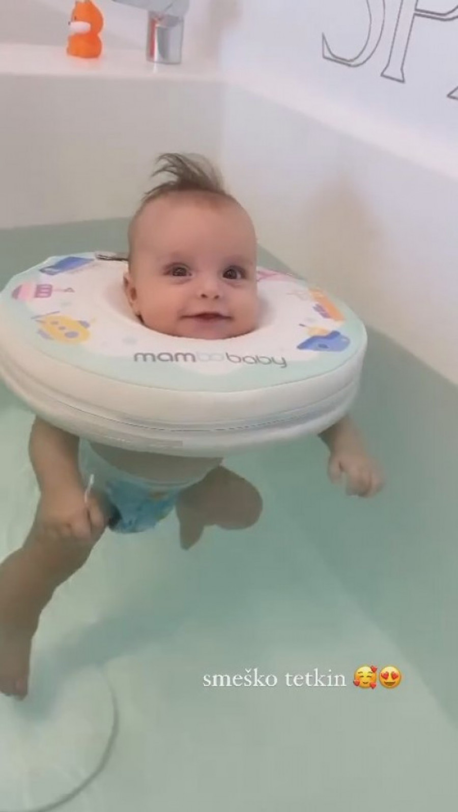 „Smeško tetkin”, stoji u opisu snimka vesele bebe koja se brčka u kadi. Nasmejani Krstan uči da pliva, u čemu mu pomaže posebna oprema – šlauf oko vrata.