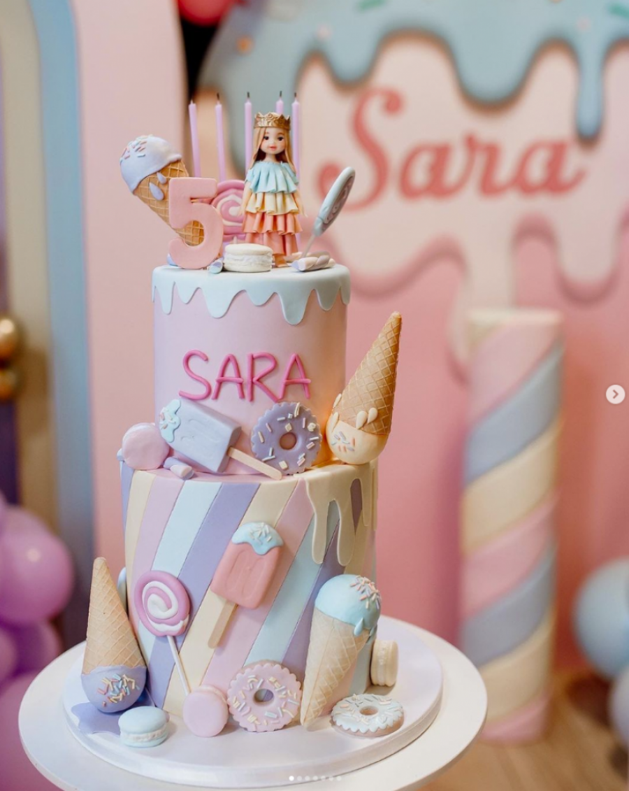 A kad smo već kod torte – lepšu skoro niste videli. Nežne boje, korneti, makaronsi i krofnice od fondana, a na samom vrhu replika Sarinog rođendanskog izdanja. Torta je sigurno ukusna pored toga što izgleda fantastično, i moramo priznati da bi nam malo bilo žao da isečemo ovakvo remek-delo.
