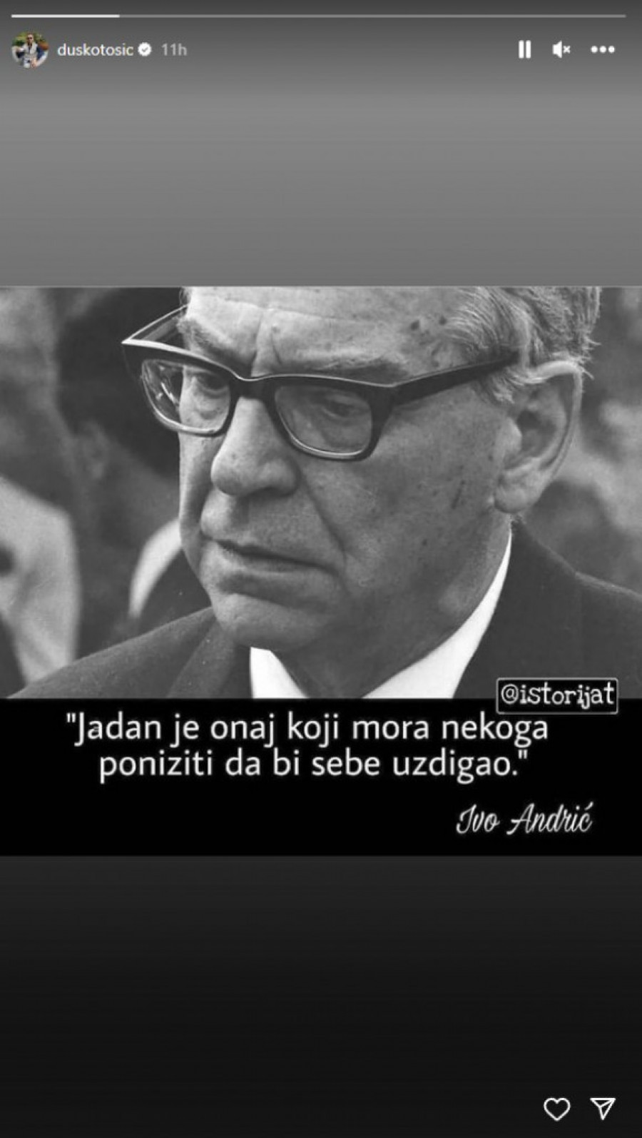 „Jadan je onaj koji mora nekoga da ponizi da bi sebe uzdigao“, citirao je Tošić slavnog Ivu Andrića.