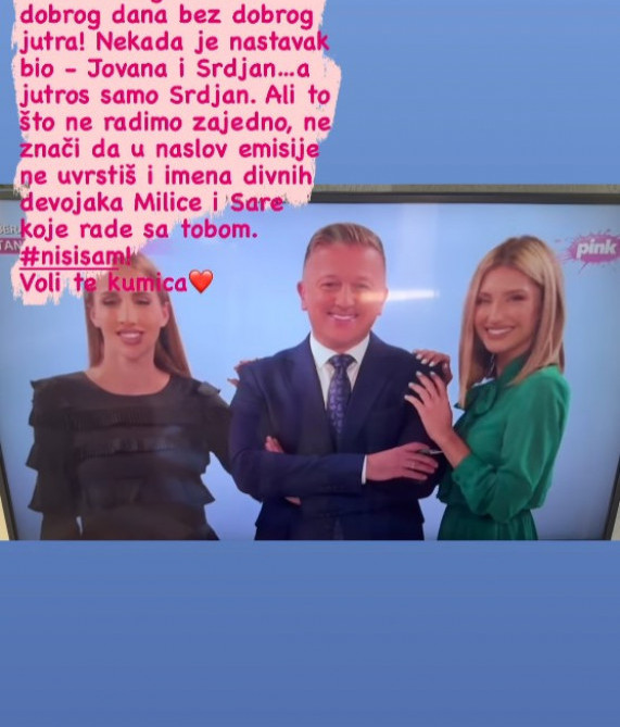 „Lepo je videti Srđana Predojevića u starom dobrom terminu. Preseče me kad sam videla džingl – nema dobrog dana bez dobrog jutra! Nekada je nastavak bio Jovana i Srđan... a jutros samo Srđan. Ali to što ne radimo zajedno, ne znači da u naslov emisije ne uvrstiš i imena divnih devojaka Milice i Sare koje rade sa tobom. #nisisam! Voli te kumica.”