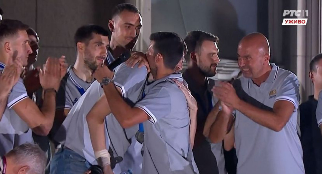 Na balkon su prvo izašli članovi stručnog štaba basketaša, a onda i naši zlatni momci, koji su u Jerusalimu osvojili šampionsku titulu, a onda se naciji obratio Strahinja Stojačić, a zatim košarkaši i stručni štab i za njima Đoković.
