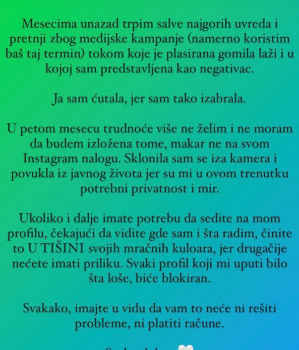 “Ukoliko i dalje imate potrebu da sedite na mom profilu, čekajući da vidite gde sam i šta radim, činite to u tišini svojih mračnim kuloara, jer drugačije nećete imati priliku. Svaki profil koji mi uputi bilo šta loše, biće blokiran. Svakako imajte u vidu da vam to neće rešiti probleme, ni platiti račune, svako dobro”.