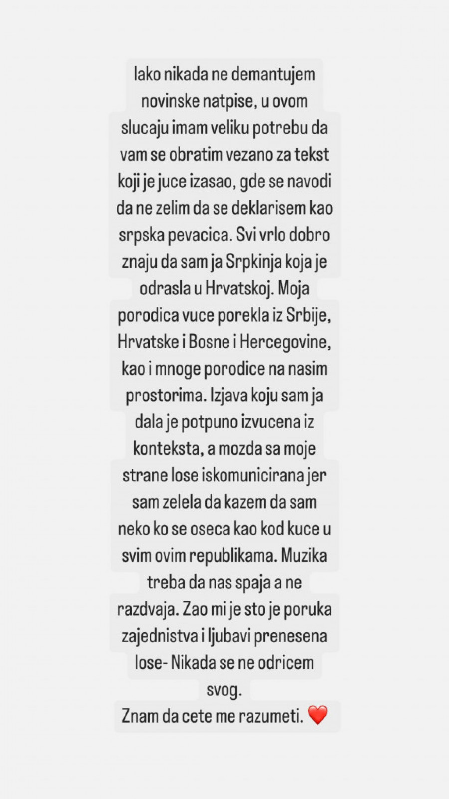 – Izjava koju sam dala potpuno je izvučena iz konteksta, a možda i s moje strane loše sročena, jer sam želela da kažem da sam neko ko se oseća kao kod kuće u svim ovim republikama. Muzika treba da nas spaja, a ne razdvaja. Žao mi je što je poruka zajedništva i ljubavi prenesena loše. Nikada se ne odričem svog. Znam da ćete me razumeti – napisala je pevačica i na kraju dodala srce.