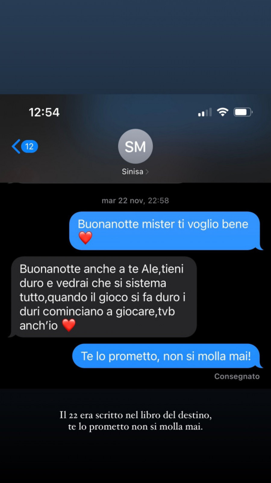Ale, kako zovu Alesandra, poželeo je Siniši laku noć i dodao da ga voli, uz emotikon srca, na šta je Mihajlović odgovorio: „Laku noć i tebi. Drži se, videćeš da će sve uspeti. I ja volim tebe.“ Sa srcem. Voljako je potom napisao: „Obećavam ti, nikada neću odustati.“