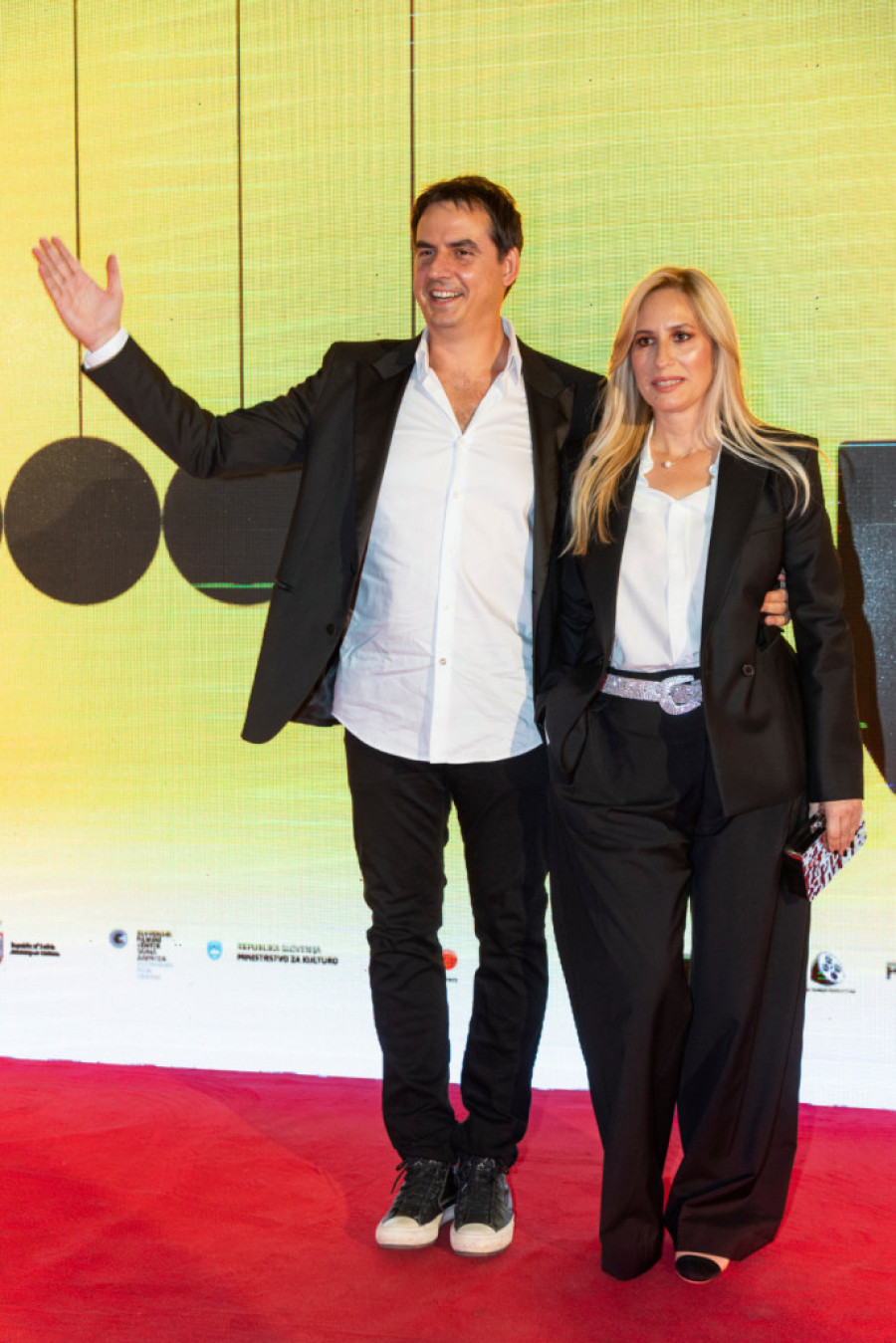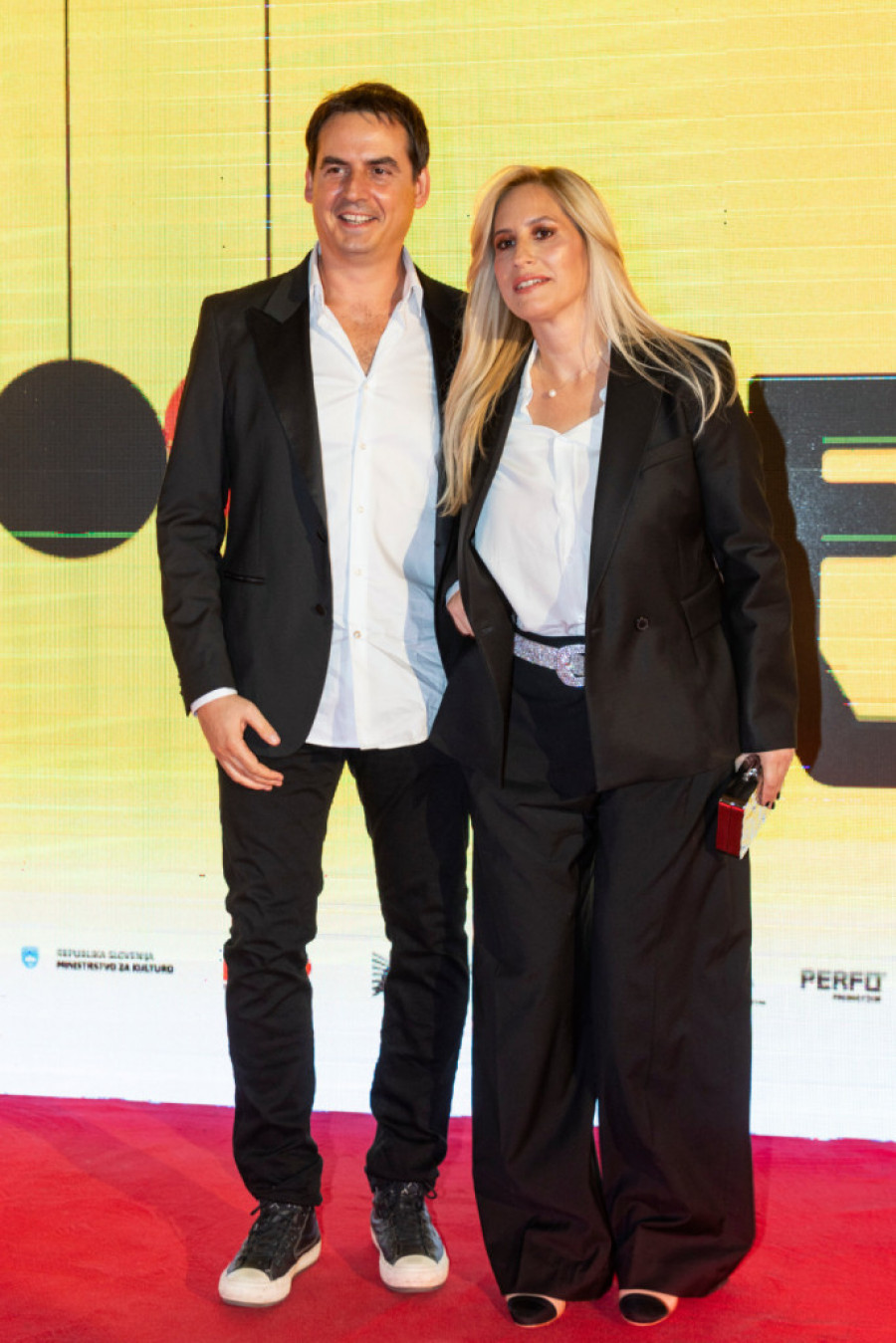 Popularni voditelj imao je crno odelo, belu košulju i – patike. Čisto da mali začini autfit, da ne deluje previše ozbiljno. Njegova supruga od asesoara je, osim osmeha, nosila i šljokičasti kaiš, diskretan, ali vrlo efektan.