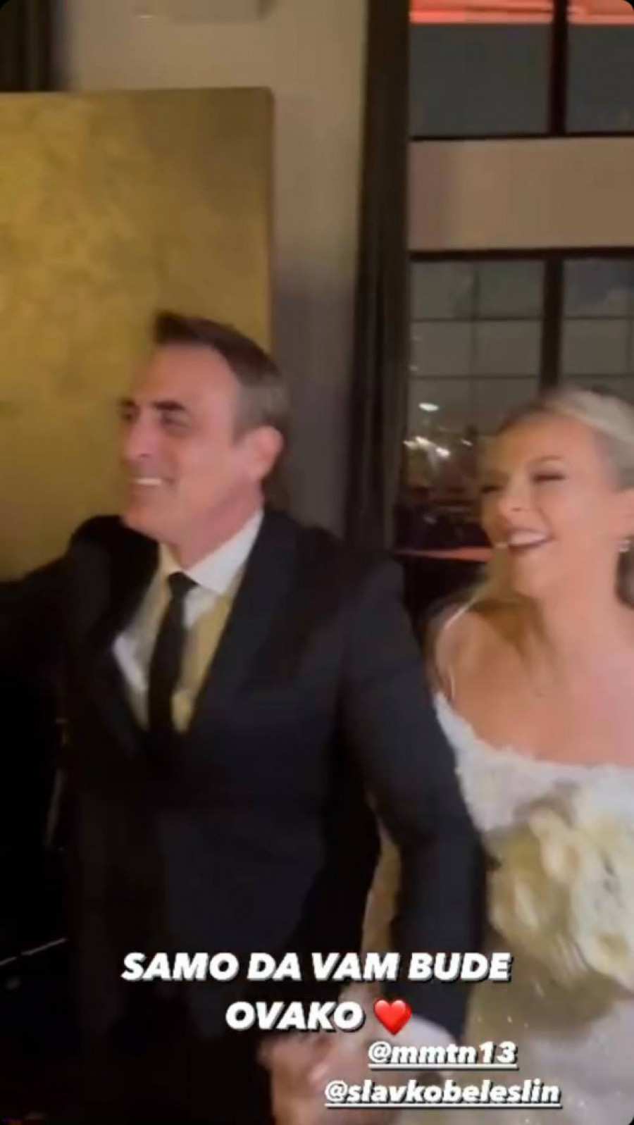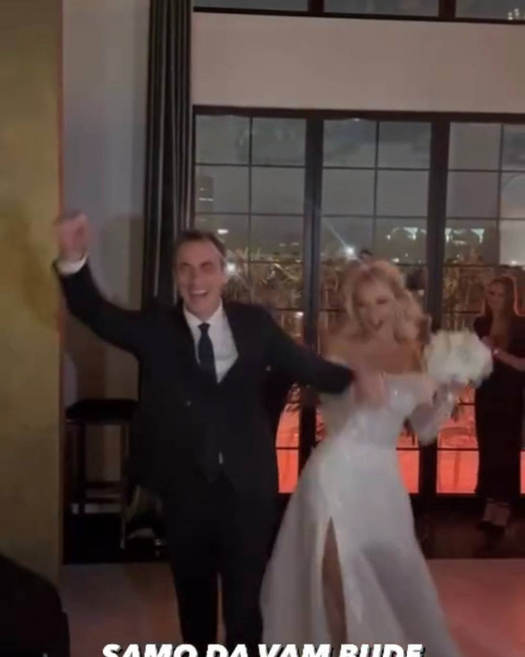 Na snimcima sa događaja mlada je blistala u beloj venčanici golih ramena i šlicem do kuka, a voditelj nije mogao da sakrije koliko je srećan.