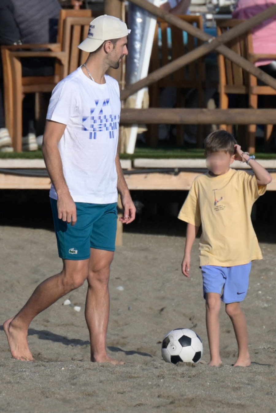 Kada ne drži reket, Nole voli da igra fudbal. Ovog puta to je učinio na pesku, bos. Stefan je sledio njegov primer, jedva dočekavši da sa tatom juri za loptom.