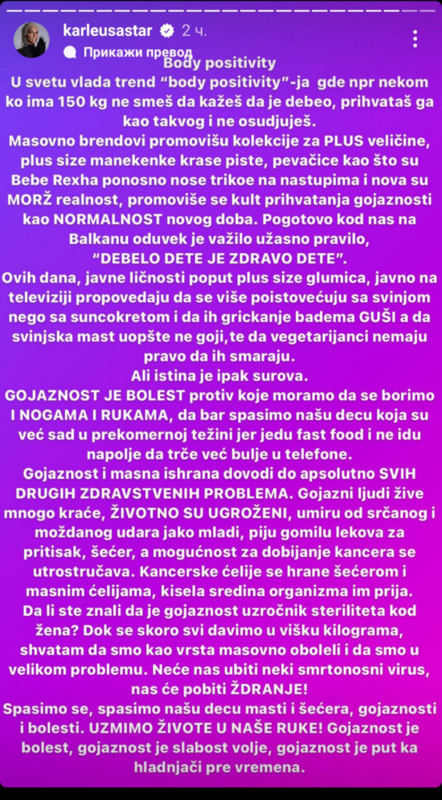 - Gojaznost je bolest protiv koje moramo da se borimo i nogama i rukama, da bar spasimo našu decu koja već sada imaju prekomernu težinu jer jedu „fast food“ i ne idu napolje da trče već bulje u telefon. Gojaznost i masna ishrana dovode do apsolutno svih drugih zdravstvenih problema - napisala je Jelena, a na fotografiji ispod možete da vidite poruku u celosti.
