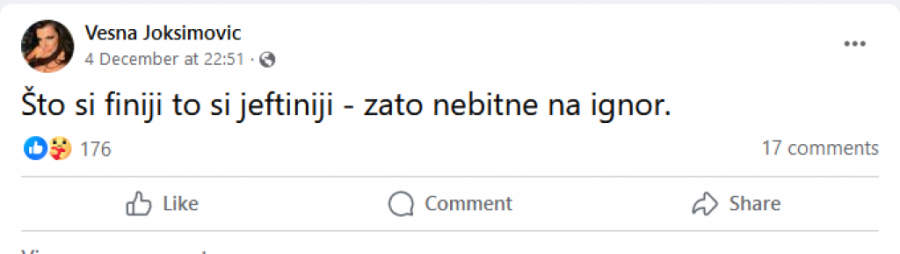 - Ne, neću ignorisati da se "zahvalim" prevarantima od prijatelja koji zovu samo kada je lepo i treba nešto… taj polusvet je samo moj promašaj. Adio! - napisala je Vesna a potom je usledila još jedna objava.