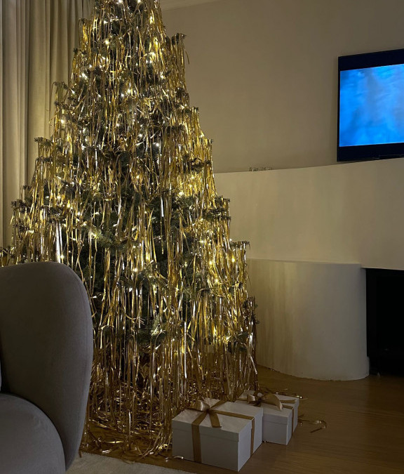 Božićno drvo pronašlo je mesto u uglu dnevne sobe, kojom se prelivaju nežni pastelni tonovi. Ukrašeno je svetlucavim trakicama, a kada se upale lampice, imate utisak kao da se zlato preliva sa visokog vrha pokrivajući celu jelku. Tu su i elegantni pokloni. Minimalizam, ali raskošan i glamurozan.