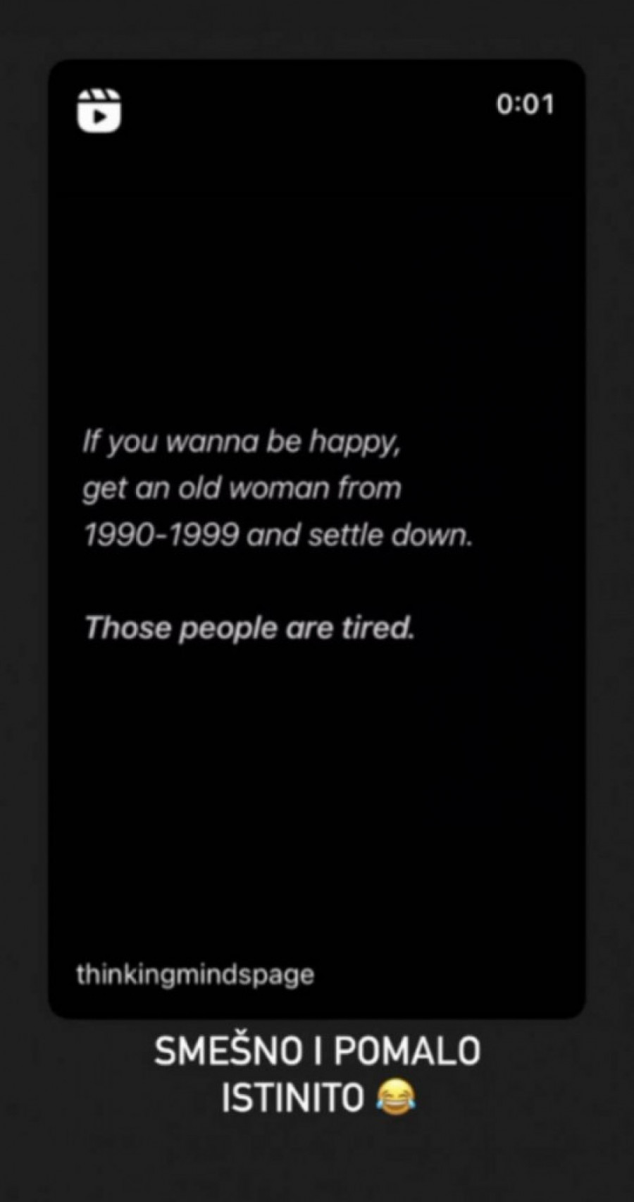 - Ako želite da budete srećni, pronađite stariju ženu od 1990. do 1999. i oženite je. One su umorne - podelila je Anica i ispod napisala: "Smešno i pomalo istinito". Da li to znači da je spremna da se uda? Jedno je sigurno, sa starijim partnerima može da se planira budućnost.